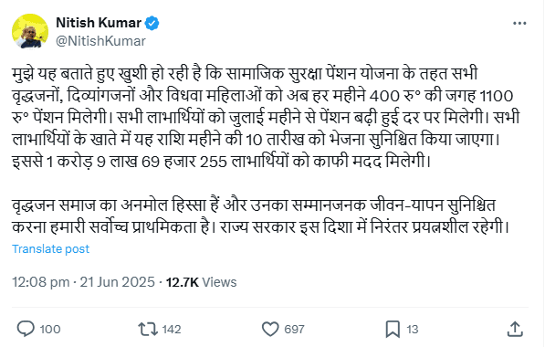 सीएम नीतीश ने ऐलान करते हुए कहा कि, “मुझे यह बताते हुए खुशी हो रही है कि सामाजिक सुरक्षा पेंशन योजना के तहत विधवा महिलाओं, वृद्धजनों और दिव्यांगजनों को अब हर महीने 400 रु की जगह 1100 रु पेंशन मिलेगी. सभी लाभार्थियों को जुलाई महीने से पेंशन बढ़ी हुई दर पर मिलेगी. सभी लाभार्थियों के खाते में यह राशि महीने की 10 तारीख को भेजना सुनिश्चित किया जाएगा. इससे 1 करोड़ 9 लाख 69 हजार 255 लाभार्थियों को काफी मदद मिलेगी. वृद्धजन समाज का अनमोल हिस्सा हैं और उनका सम्मानजनक जीवन-यापन सुनिश्चित करना हमारी सर्वोच्च प्राथमिकता है. राज्य सरकार इस दिशा में निरंतर प्रयत्नशील रहेगी.”