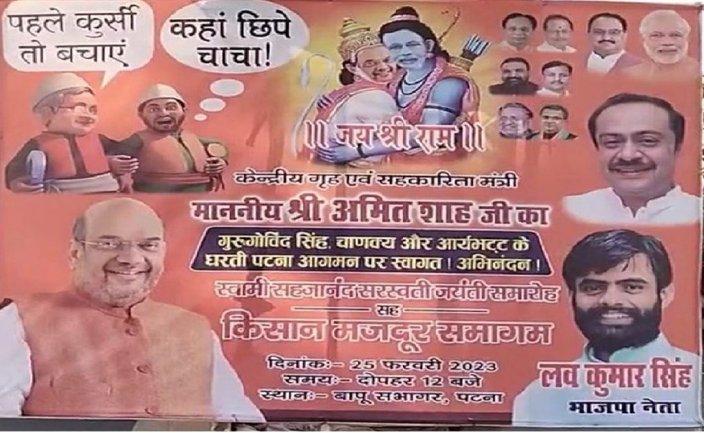 अमित शाह के दौरे को लेकर पटना में लगे भाजपा के होर्डिंग में पीएम मोदी को राम और अमित शाह को उनके हनुमान के रूप में दिखाया गया. वहीं नीतीश कुमार और तेजस्वी यादव का कार्टून भी पोस्टर के एक कोने में है.
