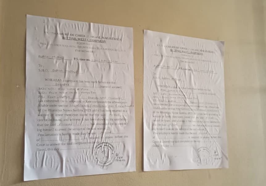 बेतिया में एक राइस मिल से मजदूर को दिनदहाड़े अगवा करके ले जाने और पिस्टल के बल पर जबरन जमीन लिखवाने के मामले में मंत्री रेणु देवी के फरार चल रहे भाई रवि कुमार उर्फ पिन्नू की गिरफ्तारी के लिए ताबड़तोड़ छापेमारी चल रही है. वहीं अब पुलिस ने कोर्ट से इश्तेहार लेने के बाद अब उसे पिन्नू के घर पर चिपकाया है. मुख्य अभियुक्त पिन्नू और उसकी पत्नी श्रद्धा रवि के खिलाफ इश्तेहार चिपकाने के लिए पुलिस बैंड बाजे के साथ पहुंची थी.