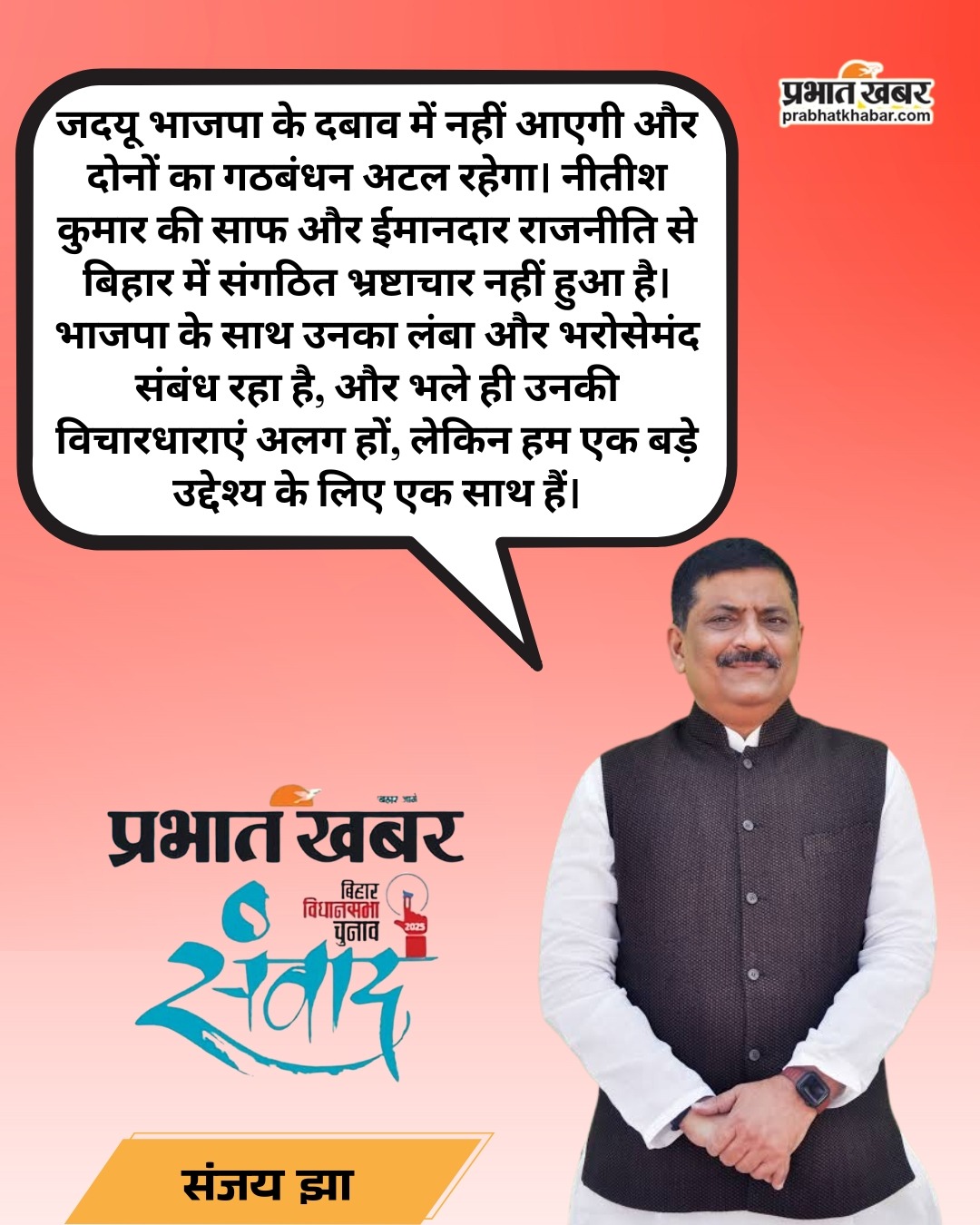 संजय झा ने कहा कि जदयू किसी भी परिस्थिति में भाजपा के दबाव में नहीं आएगी और दोनों दलों का गठबंधन मजबूत और अटूट रहेगा. उन्होंने जोर देकर कहा कि नीतीश कुमार की साफ-सुथरी और ईमानदार राजनीति की वजह से बिहार में संगठित भ्रष्टाचार कभी नहीं पनपा. भाजपा के साथ उनका रिश्ता वर्षों से भरोसे और सहयोग पर आधारित है. विचारधाराओं में अंतर होने के बावजूद हम एक बड़े उद्देश्य के लिए एकजुट हैं.