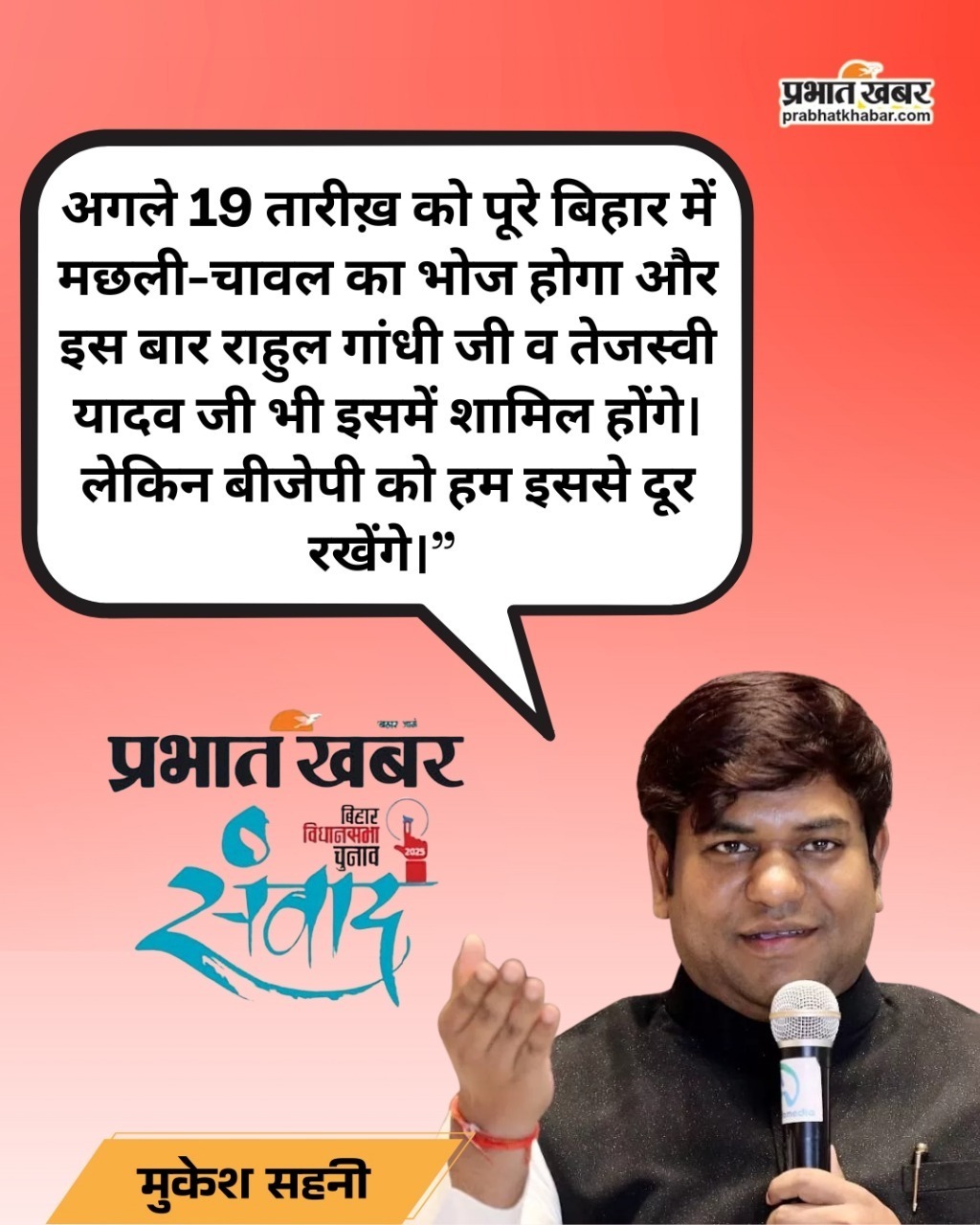 हमारा वोट बैंक है, हमारी ताकत है, और अगर सरकार हमारे वोट से बनेगी तो उसमें हमारी हिस्सेदारी भी होनी चाहिए. यह न्यायसंगत मांग है. पिछले रविवार को पूरे बिहार में मछली-चावल का भोज हुआ था. आने वाले दिनों में भी होगा, और इस बार राहुल गांधी जी, तेजस्वी यादव जी भी उसमें शामिल होंगे. लेकिन बीजेपी को हम दूर रखेंगे.