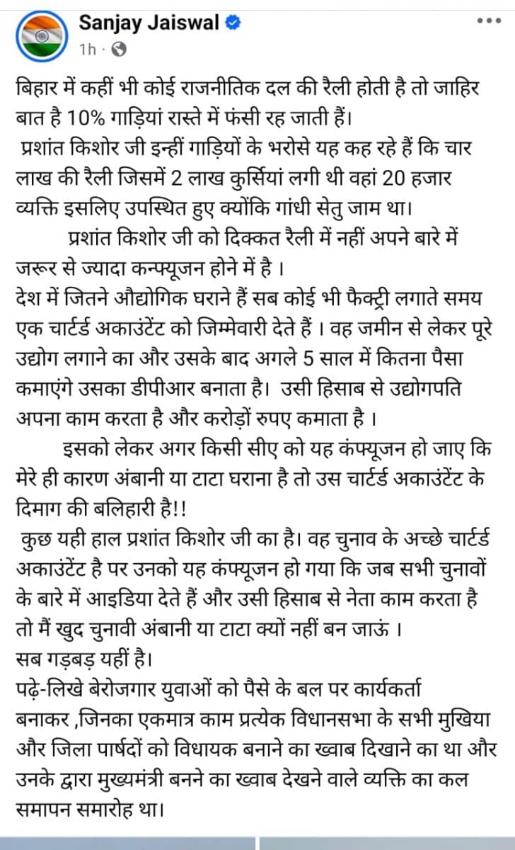 प्रशांत किशोर ने प्रशासन और सरकार पर जब सवाल उठाया तो भाजपा सांसद संजय जायसवाल ने फेसबुक पर पोस्ट करके इसपर निशाना साधा. उन्होंने लिखा कि प्रशांत किशोर को दिक्कत रैली में नहीं बल्कि अपने बारे में जरूरत से अधिक कन्फ्यूजन होने में है. पीके को संजय जायसवाल ने चुनाव का चार्टड अकाउंटेंट बताया.