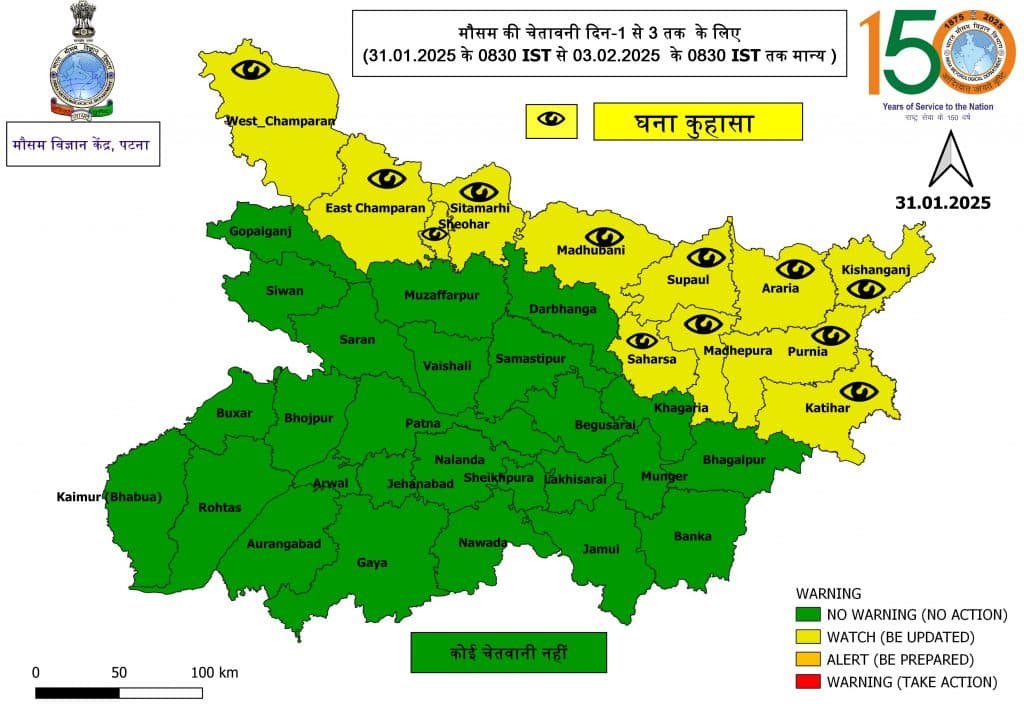 बिहार के 12 जिलों में पटना मौसम विज्ञान केन्द्र ने 3 फरवरी तक के लिए घना कुहासा को लेकर येलो अलर्ट जारी किया है. इन जिलों में पश्चिम चंपारण, पूर्वी चंपारण, शिवहर, सीतामढ़ी, मधुबनी, सुपौल, सहरसा, मधेपुरा, अररिया, किशनगंज, पूर्णिया और कटिहार शामिल है.