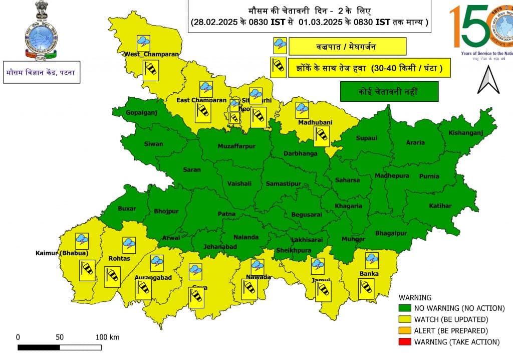 आइएमडी के मुताबिक 28 फरवरी और 1 मार्च को बेतिया, मोतिहारी, सीतामढ़ी, शिवहर, मधुबनी, कैमूर, रोहतास, औरंगाबाद, गया, नवादा, जमुई और बांका में तेज हवा चलेगी और मेघगर्जन के साथ बारिश की संभावना है. अलर्ट के मुताबिक हवा की गति 30 से 40 किमी प्रति घंटा रहने की संभावना है. इस दौरान बिहार के विभिन्न शहरों के अधिकतम और न्यूनतम तापमान में दो से चार डिग्री तक कम दर्ज की जा सकती है. विभाग ने अपने पूर्वानुमान में बताया कि मार्च के पहले हफ्ते में अधिकतम तापमान 34 डिग्री तक पहुंच सकता है.