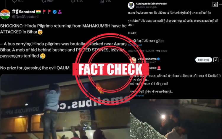 महाकुंभ 2025 जैसे-जैसे अपने समापन की ओर बढ़ रहा है, संगम स्नान के लिए प्रयागराज जाने वाले यात्रियों की भीड़ भी बढ़ती जा रही है. लोगों को जो भी साधन मिल रहा है, चाहे वो रेल हो या सड़क, श्रद्धालु महाकुंभ पहुंचने की कोशिश कर रहे हैं. हालात ये हैं कि ट्रेनों में खड़े होने की जगह नहीं है, जिनके पास आरक्षित टिकट हैं वे भी ट्रेन में नहीं चढ़ पा रहे हैं. सड़क मार्ग से यात्रा करने वाले लोगों को भी जाम की समस्या का सामना करना पड़ रहा है. इससे जुड़ी कई तस्वीरें और वीडियो सोशल मीडिया पर वायरल हो रहे हैं. इसी बीच एक और वीडियो सोशल मीडिया पर तेजी से वायरल हो रहा है. इस वीडियो में दावा किया जा रहा है कि बिहार के औरंगाबाद में महाकुंभ जा रही बस पर मुसलमानों ने हमला किया है. लेकिन इस वीडियो की सच्चाई क्या है, ये हम आपको आज बता रहे हैं.