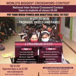 राष्ट्रीय वार्षिक अंतर-विद्यालय क्रिप्टिक क्रॉसवर्ड प्रतियोगिता का आयोजन इस बार बड़े स्तर पर होने जा रहा है़ दो चरण में आयोजित होने वाली प्रतियोगिता के लिये आनलाइन निबंधन होगा़ पंजीकरण मुफ्त होगा़
