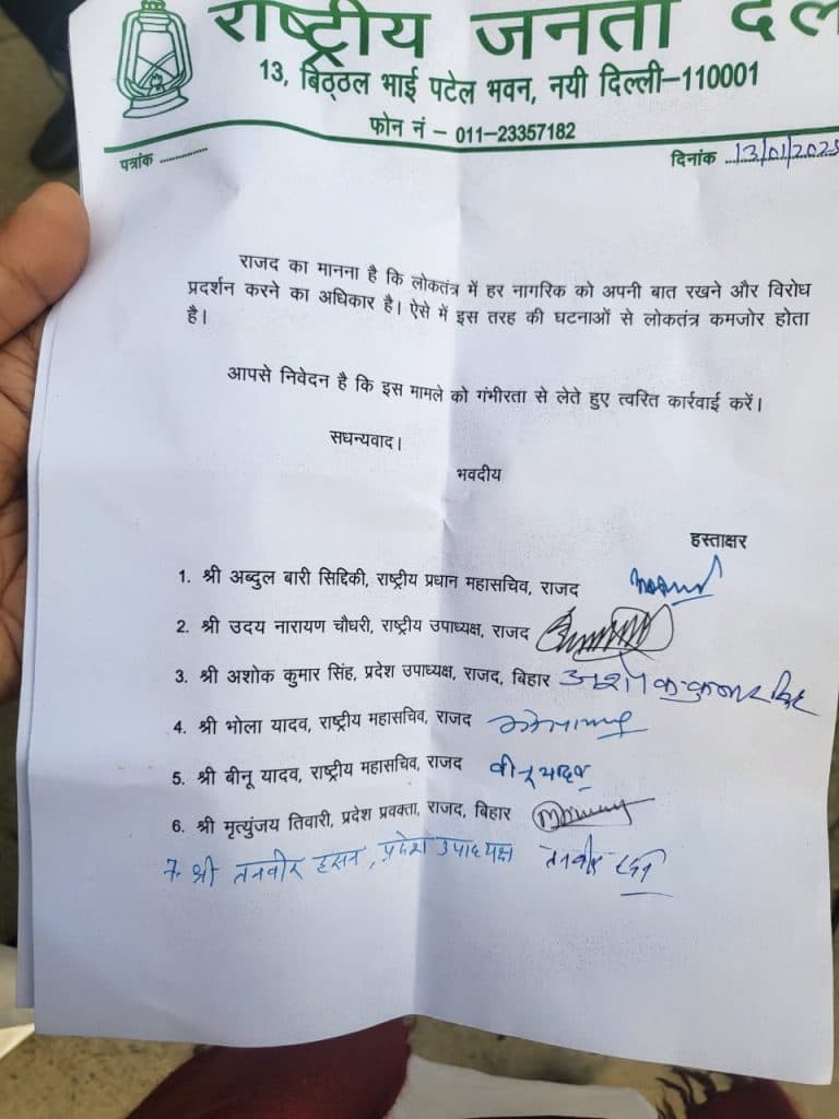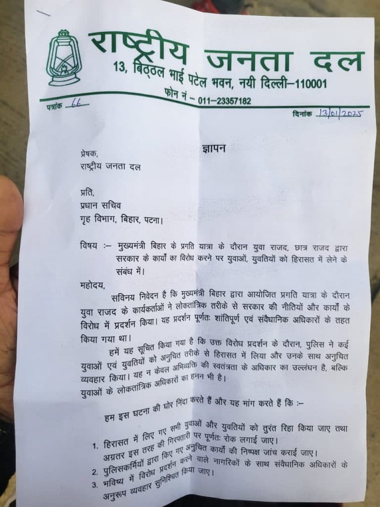 राजद प्रवक्ता चित्तरंजन गगन ने बताया कि मधुबनी, छपरा समेत राज्य के विभिन्न स्थानों पर सरकार की नीतियों एवं कार्यकलापों के विरोध में शांतिपूर्ण ढंग से प्रदर्शन कर रहे छात्र – युवाओं पर फर्जी मुकदमे कर गिरफ्तार कर जेल भेज दिया गया है. राजद प्रवक्ता ने कहा कि लोकतांत्रिक व्यवस्था में सरकार के गलत नीतियों का विरोध करना हर नागरिक को संवैधानिक अधिकार है.