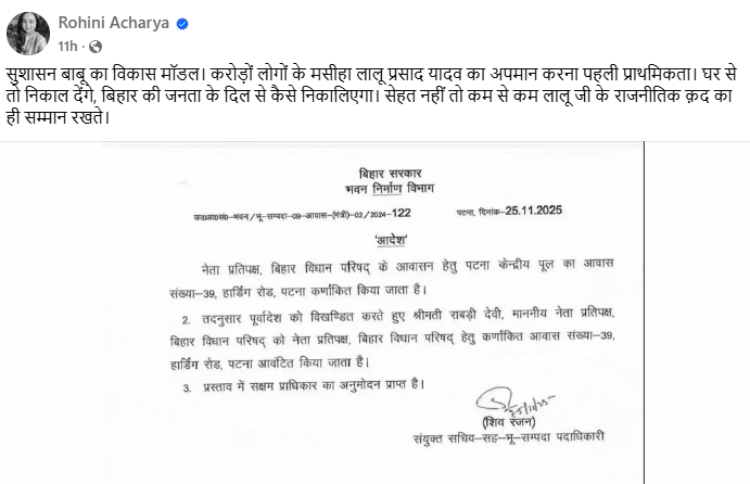 आगे अपने फेसबुक पोस्ट में रोहिणी आचार्य ने यह भी लिखा, ‘घर से तो निकाल देंगे, लेकिन बिहार की जनता के दिल से कैसे निकालिएगा. सेहत नहीं तो कम से कम लालू जी के राजनीतिक कद का ही सम्मान रखते.’ इस तरह से रोहिणी आचार्य ने सोशल मीडिया पर पोस्ट शेयर कर भड़ास निकाली. याद दिला दें, हाल ही में रोहिणी आचार्य ने पार्टी और परिवार को छोड़ने की बात कही थी. उन्होंने अपने भाई तेजस्वी यादव पर कई गंभीर आरोप लगाए थे. लेकिन अब जब लालू यादव और राबड़ी देवी से उनका बंगला ले लिया गया, तो ऐसे में रोहिणी आचार्य ने बिहार सरकार पर भड़ास निकाली.