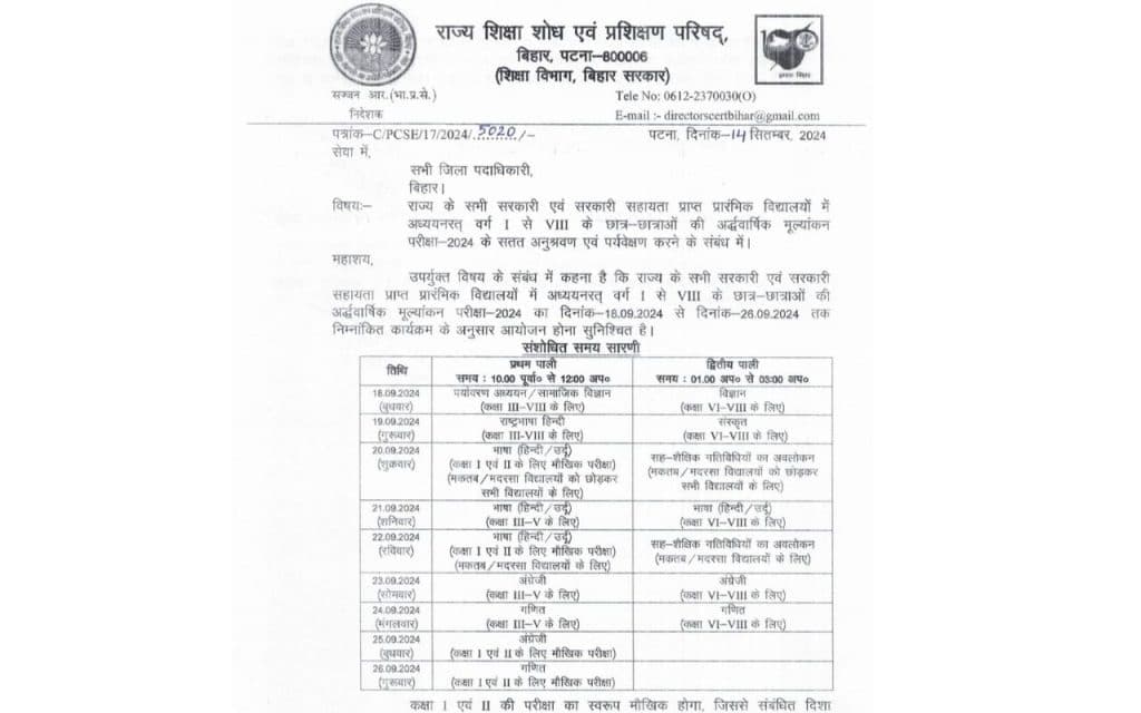 Bihar School : बिहार के सरकारी स्कूलों कक्षा एक से लेकर आठवीं तक में होने वाली अर्धवार्षिक परीक्षा का शेड्यूल जारी कर दिया गया. यह परीक्षा 18 सितंबर से 26 सितंबर तक दो पालियों में होगी.