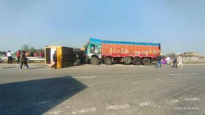 ट्रक की टक्कर से स्कूल बस पलटी, चार बच्चे घायल
