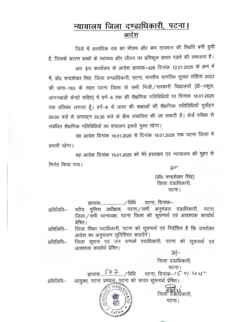पटना डीएम डॉ. चंद्रशेखर सिंह ने स्कूल बंद करने निर्देश जारी करते हुए कहा कि पटना में अत्यधिक ठंड और कम तापमान की स्थिति बनी हुई है. इसके कारण बच्चों के स्वास्थ्य और जीवन पर प्रतिकूल प्रभाव पड़ने की संभावना है. इसको देखते हुए स्कूल बंद करने का फैसला लिया गया है. इससे पहले पटना में ठंड को देखते हुए 11 जनवरी तक आठवीं कक्षा के सभी सरकारी और प्राइवेट स्कूलों को बंद रखने का निर्देश दिया गया था.