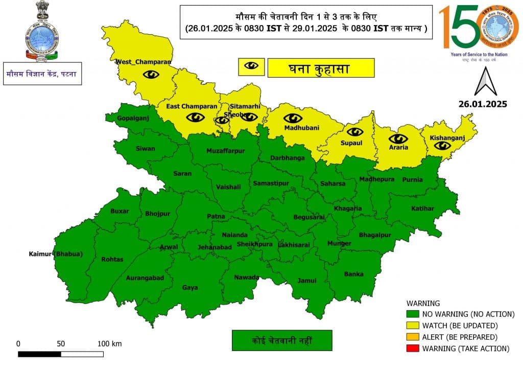 बिहार के मौसम को लेकर पटना मौसम विज्ञान केंद्र ने रविवार को जारी किये पूर्वानुमान में अगले 72 घंटे के लिए भविष्यवाणी की है. इसमें बताया गया है कि बिहार के पूर्वी चंपारण, पश्चिमी चंपारण, शिवहर, सीतामढ़ी, मधुबनी, सुपौल, अररिया और किशनगंज जिले में घने कुहासे का दौर जारी रहेगा. इस दौरान कुछ क्षेत्रों में ठंडी हवा भी चल सकती है. जिससे तापमान में गिरावट दर्ज की जा सकती है.