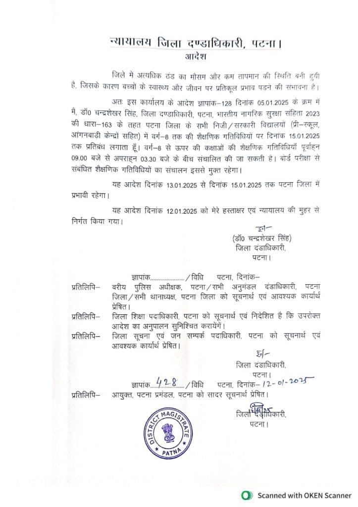 पटना डीएम डॉ. चंद्रशेखर सिंह ने बताया कि पटना में अत्यधिक ठंड और कम तापमान की स्थिति बनी हुई है. इसके कारण बच्चों के स्वास्थ्य और जीवन पर प्रतिकूल प्रभाव पड़ने की संभावना है. इससे पहले पटना में ठंड को देखते हुए 11 जनवरी तक आठवीं कक्षा के सभी सरकारी और प्राइवेट स्कूलों को बंद रखने का निर्देश दिया गया था.