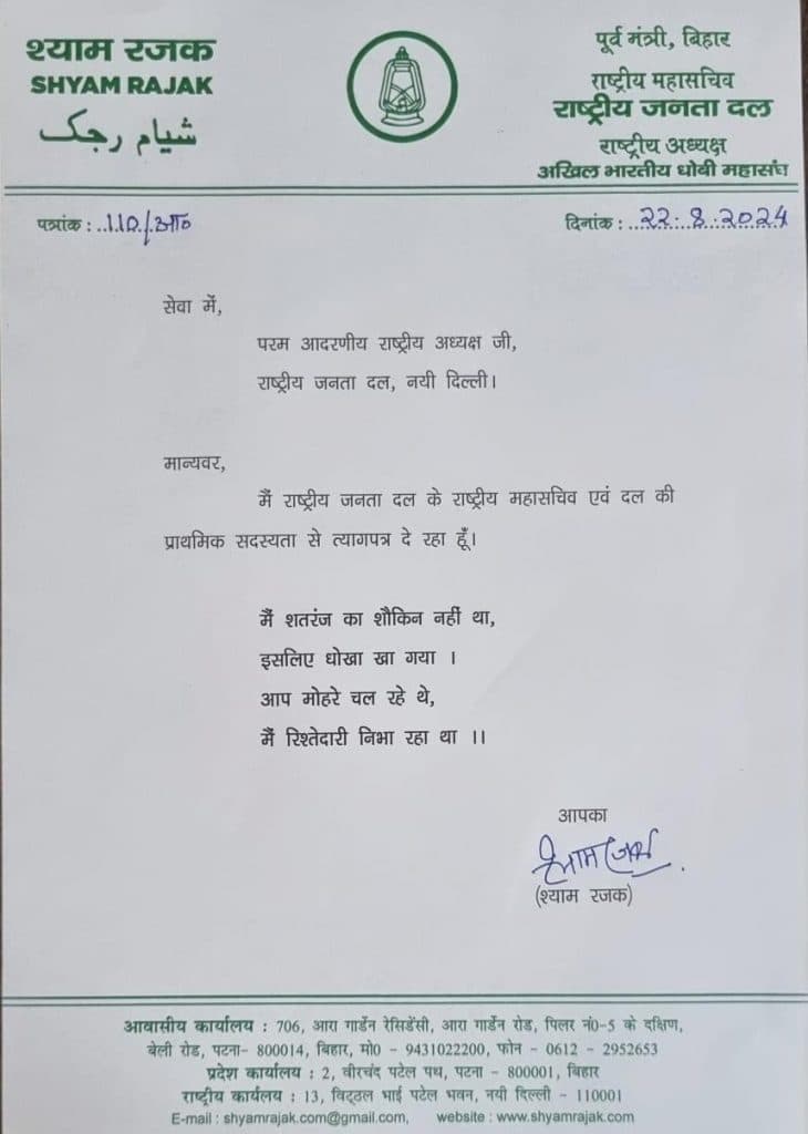 Shyam Rajak Resigns: पटना. पूर्व मंत्री और आरजेडी के राष्ट्रीय महासचिव श्याम रजक ने राजद की प्राथमिक सदस्यता से इस्तीफा दे दिया है. कहा जा रहा है कि वो जदयू में शामिल होंगे. उनके इस्तीफे की पुष्टि हो गयी. श्याम रजक ने राजद के राष्ट्रीय अध्यक्ष लालू प्रसाद यादव को पार्टी से अपना इस्तीफा भेज दिया है. श्याम रजक ने लालू यादव को भेजे पत्र में कहा गया है कि वे पार्टी के राष्ट्रीय महासचिव पद औऱ प्राथमिक सदस्यता से इस्तीफा दे रहे हैं. श्याम रजक ने अपने पत्र में लालू के लिए एक शेर भी लिखा है- “मैं शतरंज का शौकीन नहीं था, इसलिए धोखा खा गया। आप मोहरे चल रहे थे, मैं रिश्तेदारी निभा रहा था.”