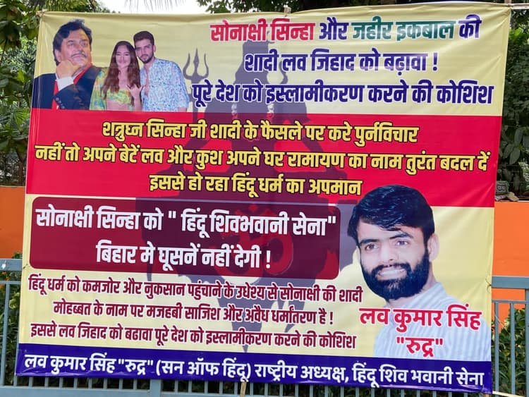 हिंदू शिव भवानी सेना की ओर से पटना में लगे पोस्टरों में शत्रुघ्न सिन्हा, सोनाक्षी सिन्हा और जहीर इकबाल की फोटो लगाई गई है. पटना में लगे पोस्टरों पर लिखा है- “सोनाक्षी सिन्हा और जहीर इकबाल की शादी लव जिहाद को बढ़ावा है.इससे पूरे देश को इस्लामीकरण करने की कोशिश है. शत्रुघ्न सिन्हा जी शादी के फैसले पर आप पुनर्विचार करें नहीं तो अपने घर का नाम लव और कुश का नाम तुरंत बदलें, इससे हो रहा हिंदू धर्म का अपमान. सोनाक्षी सिन्हा को हिंदू शिव भवानी सेना बिहार में घुसने नहीं देगी.”