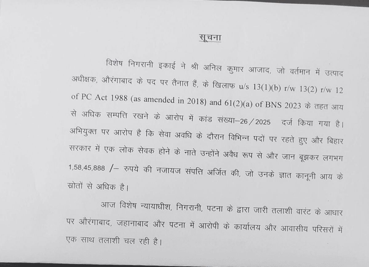अनिल कुमार आजाद पर 1.58 करोड़ रुपये से ज्यादा की अवैध संपत्ति इकट्ठा करने का आरोप है. वह इस समय पटना में मौजूद नहीं हैं. टीम उनके घरों से दस्तावेज, बैंक रिकॉर्ड और संपत्ति से जुड़े कागजात खंगाल रही है. अधिकारियों ने बताया कि आगे की कानूनी प्रक्रिया छापेमारी में मिले सबूतों के आधार पर होगी.