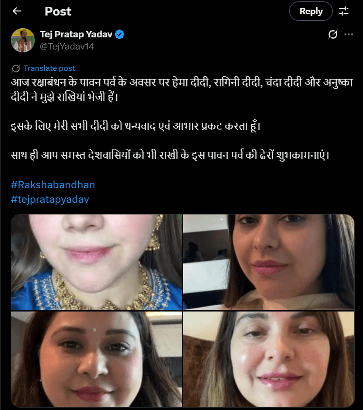 तेज प्रताप ने एक अन्य पोस्ट में लिखा है, “आज रक्षाबंधन के पावन पर्व के अवसर पर हेमा दीदी, रागिनी दीदी, चंदा दीदी और अनुष्का दीदी ने मुझे राखियां भेजी हैं. इसके लिए मेरी सभी दीदी को धन्यवाद एवं आभार प्रकट करता हूं. साथ ही आप समस्त देशवासियों को भी राखी के इस पावन पर्व की ढेरों शुभकामनाएं.” तेज प्रताप के इस पोस्ट से साफ हो गया है कि उन्हें राखी बांधने के लिए उनकी कोई भी बहन नहीं आई.
