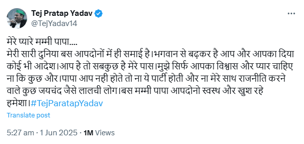 Also Read: तेजप्रताप यादव ने किसे कहा ‘जयचंद जैसा लालची’? पार्टी-परिवार से आउट हुए तो लालू को लिखा संदेश