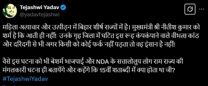 Bihar News: बिहार के नालंदा में एक महिला को बर्बरता से मौत के घाट उतारा तो बिहार की राजनीति इस घटना से गरमायी है. तेजस्वी यादव ने सरकार को घेरा है.
