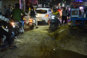 पटेल नगर के बाबा चौक पर भी सीवरेज पाइप लाइन बिछाने के लिए दो महीने पहले एक बड़ा गड्ढा खोदा गया था. लगभग एक महीने तक काम चलने के बाद इस गढ्ढे को भर भी दिया गया है, लेकिन पिचिंग तो दूर, गड्ढ़े को भरते समय समतल भी नहीं किया गया है और बालू- गिट्टी से बेतरतीब ढंग से भर कर छोड़ दिया गया है. अलग-बगल में सीवरेज पाइप बिछाने के लिए अन्य गढ्ड़ों को खोदने के कारण भी यहां से वाहनों को गुजरने के लिए बहुत कम जगह मिल रही है और उन्हें आने-जाने में परेशानी हो रही है.