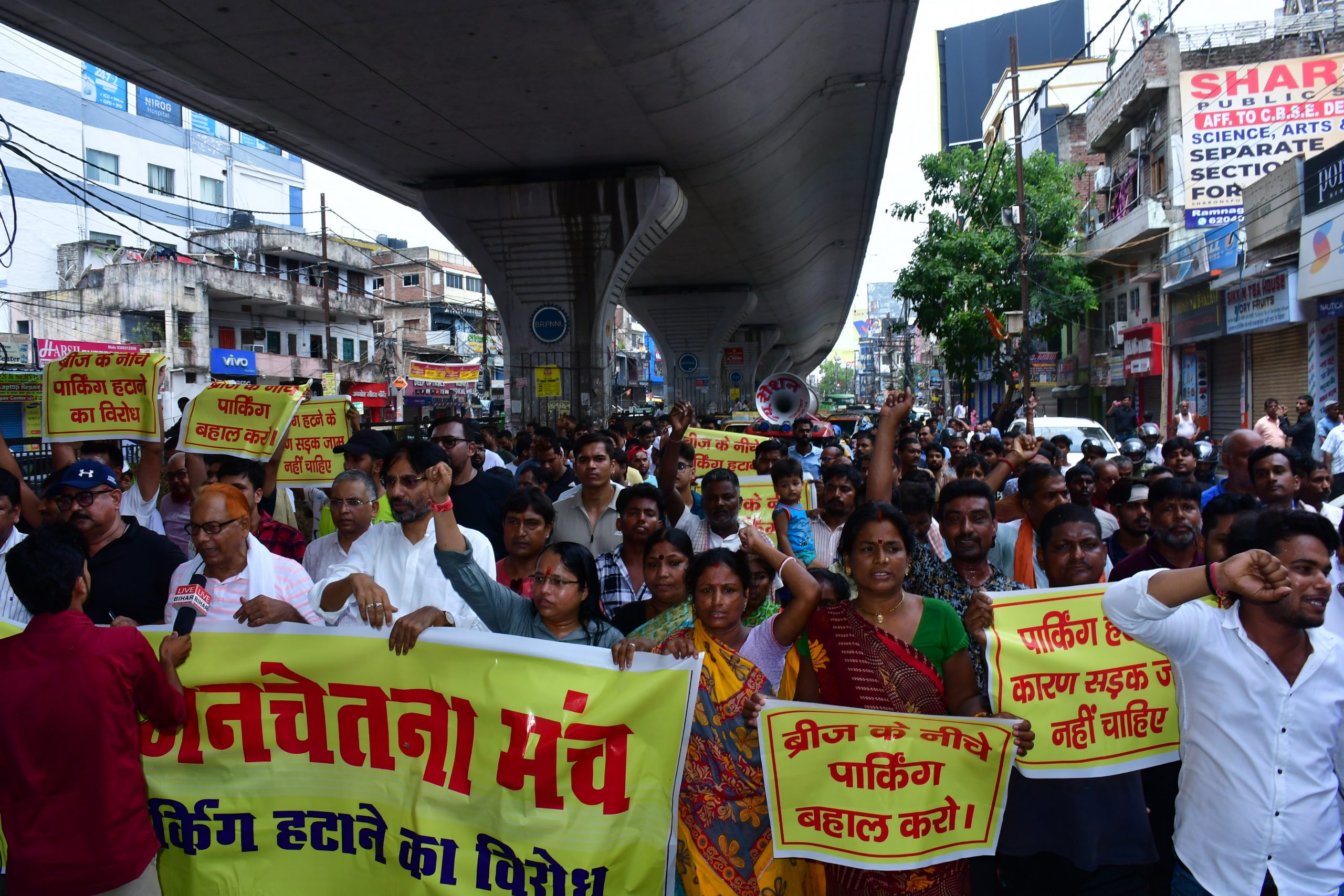 पार्किंग हटाने के विरोध में बंद रहीं दुकानें, निकाला जुलूस: