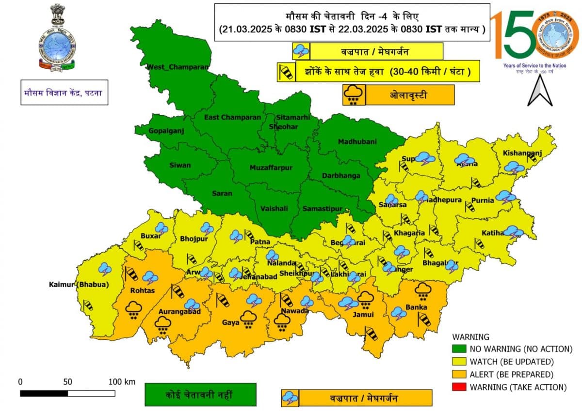 Bihar Rain Alert: मौसम विभाग ने बिहार के कई जिलों में तेज बारिश, आंधी और ओलावृष्टि की संभावना जताते हुए ऑरेंज अलर्ट जारी किया है. 21 और 22 मार्च को कई इलाकों में बिजली गिरने और तेज हवाओं के साथ मूसलाधार बारिश होने की आशंका है.