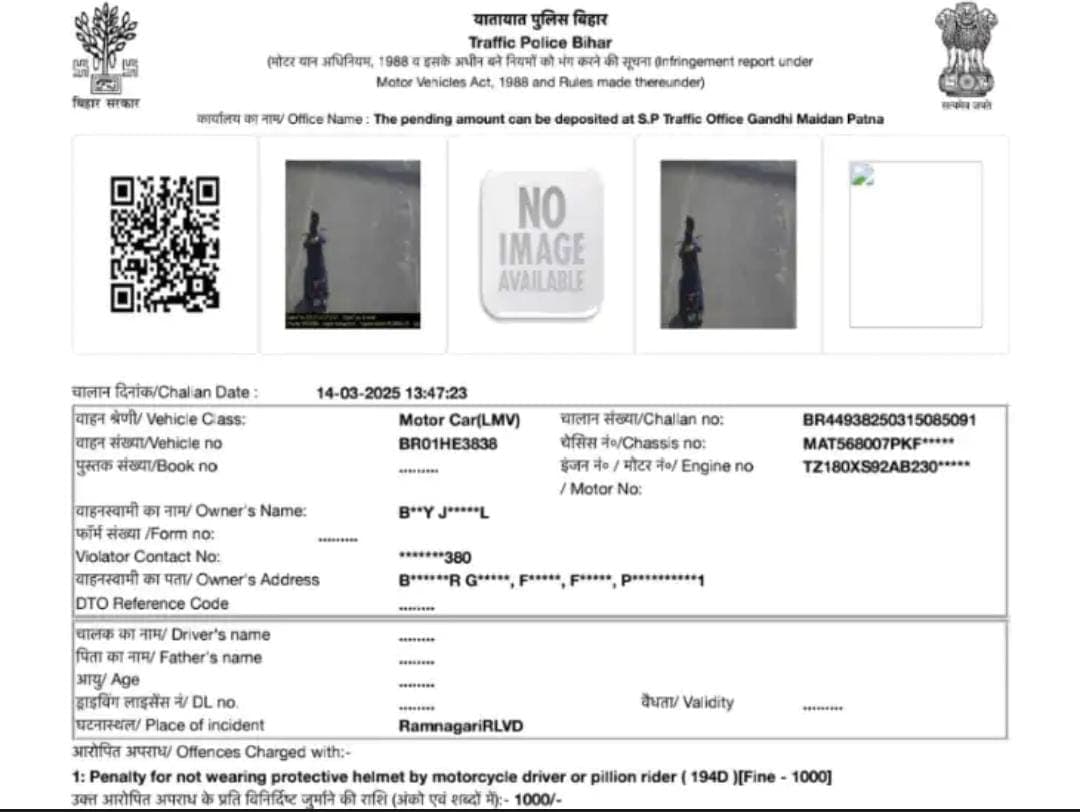 मामला बेउर थाना क्षेत्र का है, जहां बेबी जायसवाल के नाम से पंजीकृत कार (BR01HE/3838) के खिलाफ 15 मार्च को ई-चालान जारी किया गया. जब कार मालिक को चालान का मैसेज मिला तो उन्होंने देखा कि चालान में एक मोटरसाइकिल की फोटो लगी थी. जिसमें पीछे बैठा व्यक्ति बिना हेलमेट के नजर आ रहा था. यह देखकर परिवार हैरान रह गया.