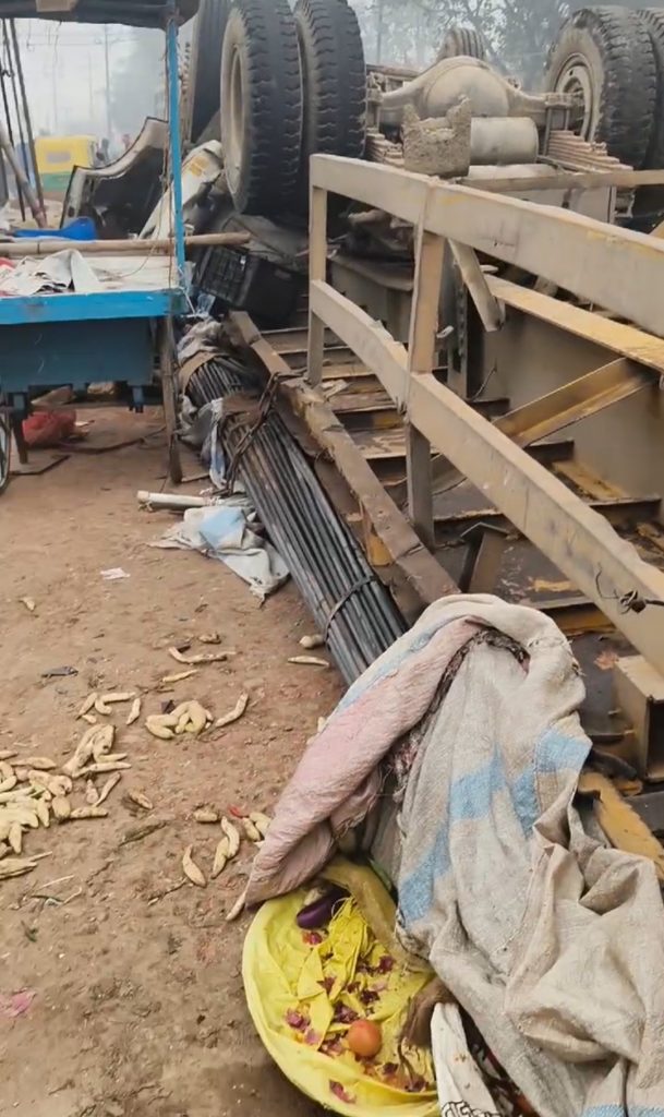 गौरीचक में कोहरे में छड़ लगा ट्रेलर पलटा, कई दुकानें हुईं क्षतिग्रस्त