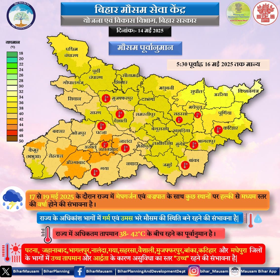 Bihar Weather News: राजधानी समेत प्रदेश के मौसम का अलग मिजाज बना हुआ है. बिहार मौसम सेवा केंद्र के अनुसार अगले 24 घंटों के दौरान पटना सहित पूरे राज्य में आंधी पानी का दौर शुरू हो जाएगा. हालांकि राज्य के अधिकांश भागों में गर्म और उमस भरे मौसम की स्थिति बने रहने की संभावना है. 17 से 19 मई 2025 के दौरान राज्य में मेघगर्जन एवं वज्रपात के साथ कुछ स्थानों पर हल्की से मध्यम स्तर की वर्षा होने की संभावना है. गुरुवार और शुक्रवार को राज्य में अधिकतम तापमान 38 से 42 डिग्री सेल्सियस के बीच रहने का पूर्वानुमान है. पटना, जहानाबाद, भागलपुर, नालंदा, गया, सहरसा, वैशाली, मुजफ्फरपुर, बांका, कटिहार और मधेपुरा जिलों के भागों में हीट वेव की स्थिति बनी रह सकती है.