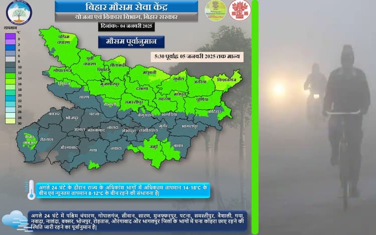 अगले 24 घंटे के दौरान राज्य के अधिकांश भागों में अधिकतम तापमान 14 से 18 डिग्री के बीच एवं न्यूनतम तापमान 8 से 12 डिग्री सेल्सियस के बीच रहने की संभावना है. वहीं अगले 24 घंटे में पश्चिम चंपारण, गोपालगंज, सीवान, सारण, मुजफ्फरपुर, पटना, समस्तीपुर, वैशाली, गया, नवादा, नालंदा, भोजपुर, रोहतास, औरंगाबाद और भागलपुर जिलों के भागों में घना कोहरा छाए रहने की स्थिति जारी रहने का पूर्वानुमान है.