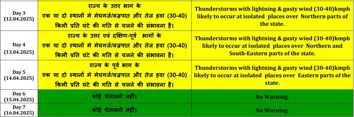 IMD की लेटेस्ट वेदर रिपोर्ट के अनुसार, बिहार में 14 अप्रैल 2025 तक कई जिलों में बारिश होगी. इस दौरान तेज हवाएं भी चलने की संभावना है. इसके बाद 15 अप्रैल से मौसम में भारी बदलाव देखने को मिलेगा. साइक्लोनिक सर्कुलेशन पूरब की तरफ शिफ्ट हो जाएगा, जिसकी वजह से बारिश की स्थिति खत्म हो जाएगी. और एक बार फिर बिहार में भीषण गर्मी का प्रकोप शुरू होगा.