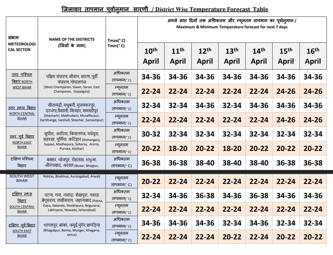 बीते दिनों से बिहार में हो रही बारिश की वजह से तापमान में भी गिरावट दर्ज की गई है. 4-6 डिग्री सेल्सियस तक तापमान में बदलाव हुआ है. लेकिन, 15 अप्रैल से बिहार के न्यूनतम तापमान में 2-3 डिग्री का इजाफा देखने को मिल सकता है. वहीं अधिकतम तापमान में मामूली बदलाव देखने को मिल सकता है.