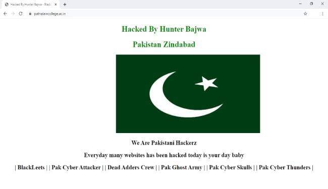 जानकारी के मुताबिक, पटना लॉ कॉलेज की वेबसाइट www.patnalawcollege.ac.in/ को पाकिस्तानी हैकर्स ने हैक कर लिया. लॉ कॉलेज की वेबसाइट हैकर्स ने पाकिस्तान का झंडा लगाते हुए सबसे ऊपर ‘हैक्ड बाय हंटर बाजवा’ लिखा है. उसके नीचे ‘पाकिस्तान जिंदाबाद’ का नारा लिखा है. फिर पाकिस्तान का झंडा लगा है. झंडे के नीचे लिखा है ‘वी आर पाकिस्तानी हैकर्स’. फिर लिखा है- ”रोज ढेर सारी वेबसाइट्स हैक करते हैं. आज आपकी बारी है.” हैकर्स ने अंतिम पंक्ति में ‘ब्लैकलीट्स’, ‘पाक साइबर अटैकर’, ‘डेड एडर्स क्र्यू’, ‘पाक घोस्ट आर्मी’, ‘पाक साइबर स्कल्स’, ‘पाक साइबर थंडर्स’ लिखा है.