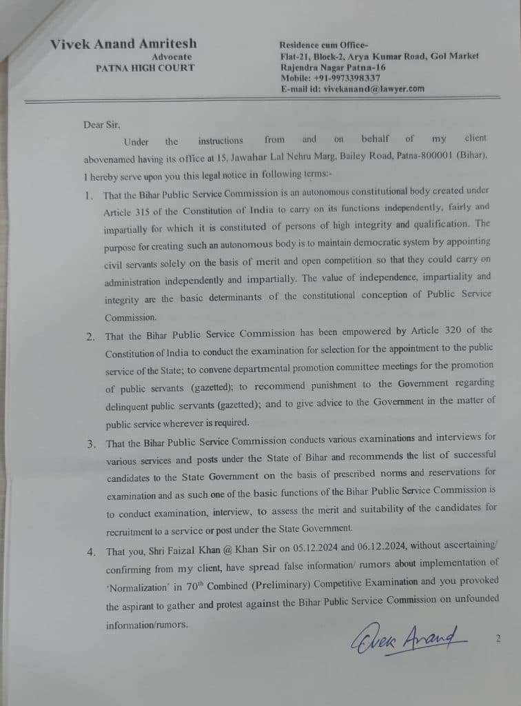आयोग ने लीगल नोटिस में लिखा फैसल खान @ खान सर की टिप्पणी न सिर्फ अपमानजनक है बल्कि ये निराधार भी है. इन्होनें अभ्यर्थियों को बिहार लोक सेवा आयोग (BPSC) के खिलाफ इकट्ठा होकर विरोध प्रदर्शन करने के लिए उकसाया है, जिससे कानून व्यवस्था की स्थिति खराब हुई है. खान सर का यह काम अनुचित और पूरी तरह से कानून के खिलाफ है.
