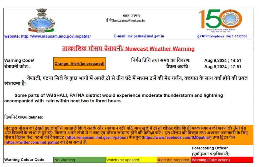 मौसम विभाग द्वारा जारी चेतावनी के अनुसार पटना और वैशाली जिला के कुछ भागों में अगले दो से तीन घंटों में झमाझम बारिश होगी. इस दौरान मेघ गर्जन के साथ आकाशीय बिजली गिरने की भी संभावना है. मौसम विभगा ने इन दोनों जिला के लिए ऑरेंज अलर्ट जारी किया है.