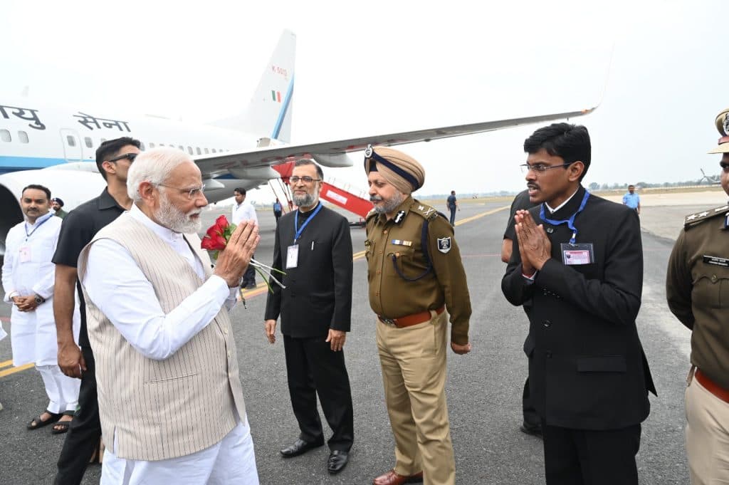 बिहार गया एयरपोर्ट पर पीएम नरेंद्र मोदी का स्वागत करते बिहार के मुख्य सचिव और डीजीपी, फोटो- प्रशांत पप्पू