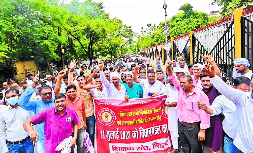 पटना में शिक्षकों के प्रदर्शन को लेकर जेपी गोलंबर के साथ ही डाकबंगला चौराहा, आर ब्लॉक चौराहा, गर्दनीबाग धरनास्थल व विधानसभा की ओर जाने वाले तमाम मार्गों पर बड़ी संख्या में पुलिस बल की तैनाती थी. एक तरह से विधानसभा की ओर जाने वाले तमाम रास्तों को सील कर दिया गया था.