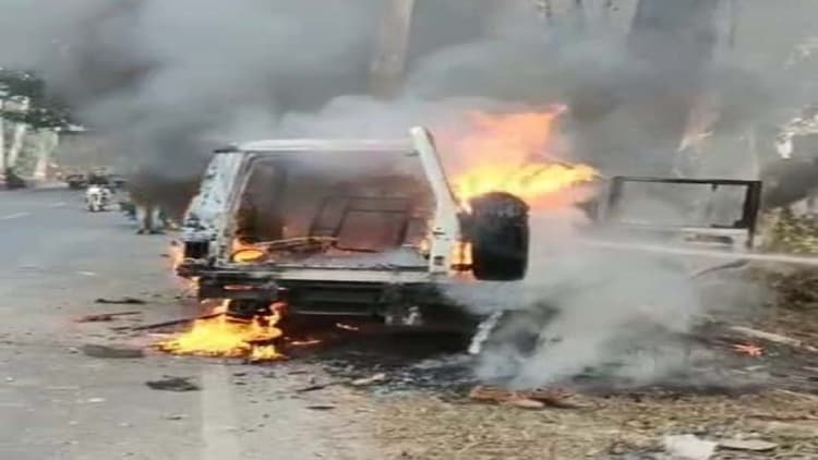 दुर्घटना के बाद मची अफरातफरी गाड़ी धू- धू कर जल गया वाहन