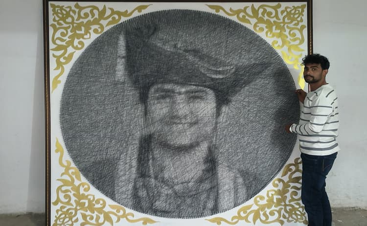 पटना के खगौल के रहने वाले कलाकार रमण चंद्रवंशी और उनके सहयोगी कलाकार रवि, अंबरीष और शशि ने मिलकर बाबा बागेश्वर धाम पं धीरेंद्र शास्त्री की तस्वीर धागे से तैयार की है. यह तस्वीर आठ फुट चौड़ा व आठ फुट लंबा है. ये सभी छात्र पटना आर्ट एंड क्राफ्ट कॉलेज के मूर्तिकला विभाग के फाइनल इयर में पढ़ रहे हैं. रमण बताते हैं कि अपनी टीम के साथ उन्होंने इस धागे की तस्वीर को छह दिनों में पूरा किया है. 13 मई को बाबा बागेश्वर पटना आ रहे हैं. ऐसे में उन्होंने आयोजन समिति के समक्ष धागे से तस्वीर बनाकर भेंट करने का सुझाव रखा था, जिसे अब समिति के सहयोग से तैयार किया गया है.