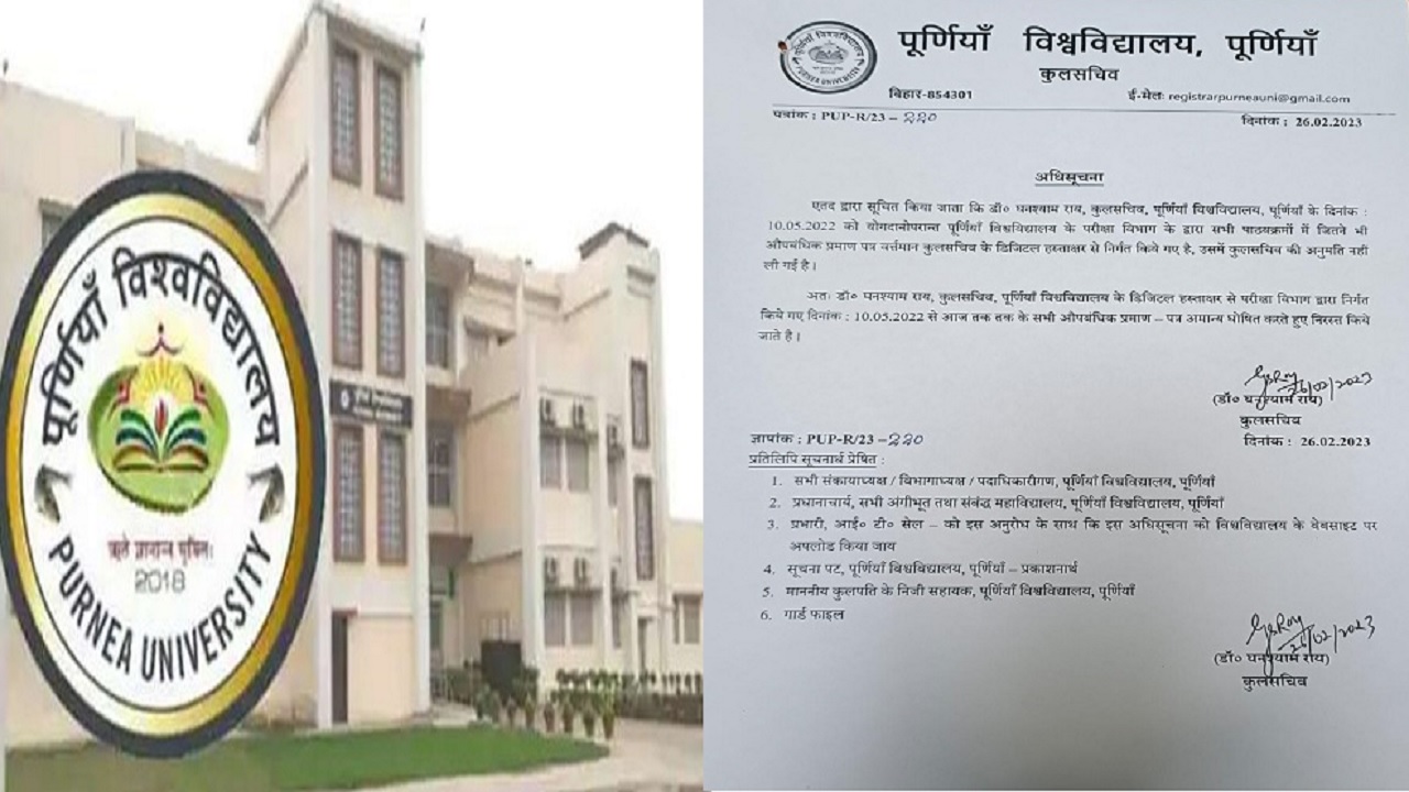 कुलसचिव डॉ. घनश्याम राय की ओर से मीडिया को जारी अधिसूचना के अनुसार 10.5.2022 को कुलसचिव डॉ. घनश्याम राय ने पूर्णिया विवि में योगदान दिया. उस तिथि के बाद से विवि परीक्षा विभाग ने सभी पाठ्यक्रमों में जितने भी औपबंधिक प्रमाण पत्र वर्तमान कुलसचिव के डिजिटल हस्ताक्षर से निर्गत किये हैं, उनमें कुलसचिव की अनुमति नहीं ली गयी है. कुलसचिव डॉ. घनश्याम राय के डिजिटल हस्ताक्षर से परीक्षा विभाग द्वारा निर्गत किये गये 10.5.2022 से अबतक के सभी औपबंधिक प्रमाण पत्र को अमान्य घोषित करते हुए निरस्त किया जाता है.