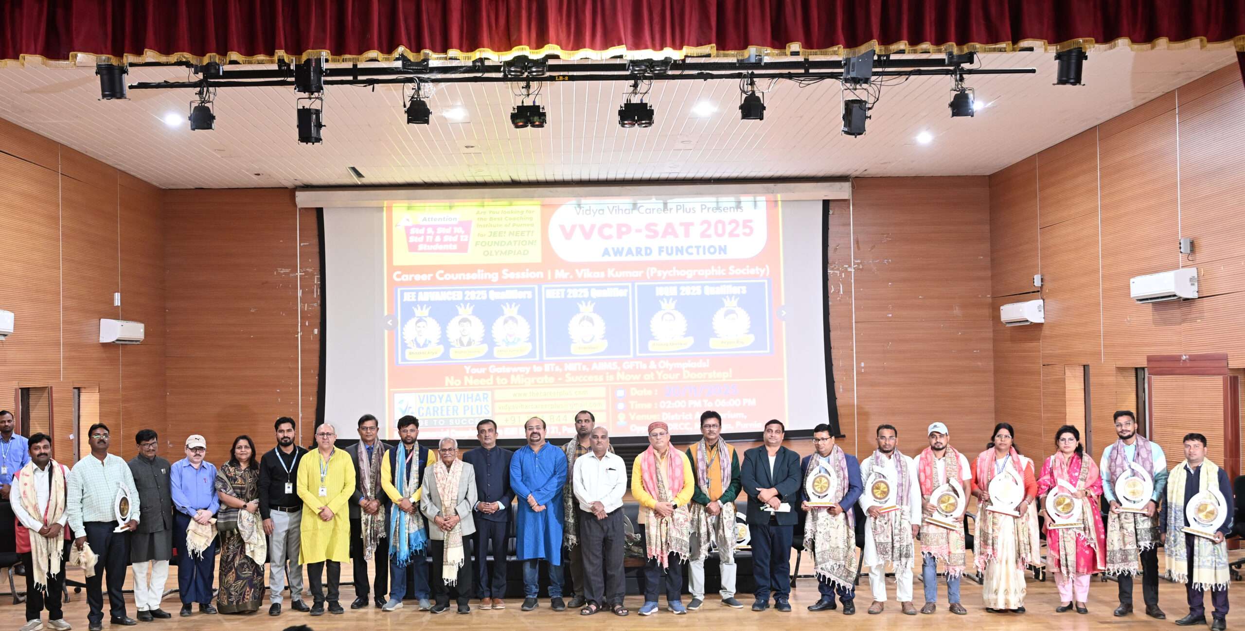 पूर्णिया. विद्या विहार करियर प्लस की ओर से आयोजित वीवीसीपी-सैट छात्रवृत्ति परीक्षा के परिणामों की घोषणा व विशेष करियर काउंसलिंग कार्यक्रम बीते 20 नवंबर को जिला ऑडिटोरियम, पूर्णिया में भव्य रूप से आयोजित किया गया. इस परीक्षा में कुल 1658 छात्रों की ऐतिहासिक भागीदारी दर्ज की गयी. संस्थान के डायरेक्टर प्रशांत शंकर ने बताया कि पूर्णिया व सीमांचल के लगभग सभी प्रमुख विद्यालयों जैसे वीवीआरएस, अररिया जेएनवी, ब्राइट करियर, बिजेंद्र पब्लिक स्कूल, एसआरडीएवी, सरस्वती विद्या मंदिर, केंद्रीय विद्यालय, इंडियन पब्लिक स्कूल, डीएपीएस, ब्राइट फ्यूचर स्कूल, आज़ाद नेशनल अकादमी, टॉपर्स प्वाइंट व अन्य शिक्षण संस्थानों के प्राचार्य, उपप्राचार्य, शिक्षक व प्रशासक इस आयोजन में शामिल हुए तथा अपने उत्साहपूर्ण सहयोग से कार्यक्रम को सफल बनाया. कार्यक्रम में देश के शीर्ष दस करियर काउंसलर्स में शामिल प्रतिष्ठित करियर विशेषज्ञ विकास कुमार ने विद्यार्थियों को करियर चयन, लक्ष्य निर्धारण और भविष्य की योजना से संबंधित महत्वपूर्ण मार्गदर्शन प्रदान किया. कार्यक्रम की प्रमुख विशेषताओं में वीवीसीपी-सैट के परिणाम की घोषणा, योग्य व मेधावी विद्यार्थियों का सम्मान, उत्कृष्ट प्रदर्शन करने वाले सुपर ट्वेंटी समेत फोर छात्रों की सूची का विमोचन, भी शामिल थे. इस अवसर पर प्रशांत शंकर ने संस्थान के छात्रों भास्कर आर्य, राघव मिश्रा, अभय कुमार साह, अंशु भगत की आईआईटी, नीट, आईओक्यूएम, रामानुजन मैथमैटिक्स टैलेंट टेस्ट जैसी प्रतिष्ठित परीक्षाओं में उल्लेखनीय उपलब्धियों का भी उल्लेख किया. कार्यक्रम में उपस्थित विद्यार्थियों व अभिभावकों को भारत के अग्रणी करियर विशेषज्ञ विकास कुमार से प्रत्यक्ष मार्गदर्शन प्राप्त हुआ. उन्हें सही करियर स्ट्रीम चुनने, लक्ष्य तय करने और भविष्य की रणनीति बनाने संबंधी अत्यंत उपयोगी सुझाव मिले. कार्यक्रम का समापन वीवीजीआई के सचिव राजेश मिश्रा ने किया. इस आयोजन के प्रति संतोष प्रदर्शित करते हुए उन्होंने वीवीसीपी के लिए अनेक शुभेच्छाएं देते हुए कहा कि यह संस्था पूर्णिया व सीमांचल के प्रतिभाशाली छात्रों के लिए एक वरदान के रूप में उभरी है. समग्र रूप से, एक ही मंच पर करियर से संबंधित सभी प्रश्नों का समाधान मिलना विद्यार्थियों और अभिभावकों दोनों के लिए अत्यंत लाभकारी सिद्ध हुआ.