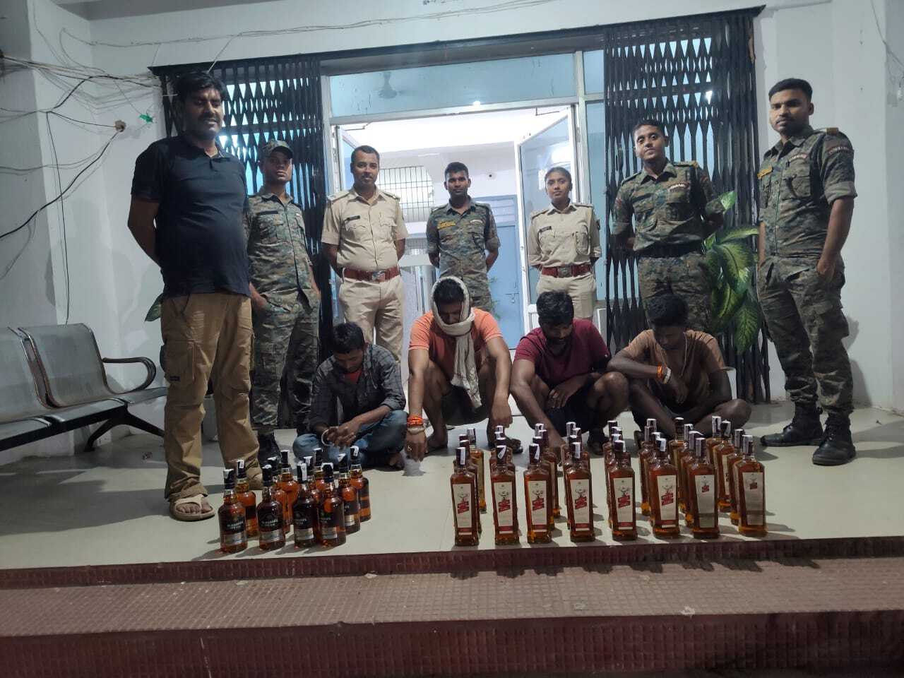पूर्णिया. बिहार विधान समा आम निर्वाचन, 2025 के अवसर पर मद्यनिषेध एवं उत्पाद विभाग, पूर्णिया द्वारा शराब निर्माणकर्ताओं,विक्रेत्ताओं, भंडारणकर्त्ताओं एवं परिवहनकर्त्ताओं के विरुद्ध निरंतर छापामारी की जा रही है.इसी क्रम में सदर मद्यनिषेध थाना की टीम द्वारा शुक्रवार को मरंगा थानान्तर्गत सतकोदरिया स्थित राहुल धर्मकांटा के पास एक करकट शीट से बने घर से कुल 32.250 लीटर विदेशी शराब की बरामदगी की गई.इस मामले में चार व्यक्तियों को गिरफ्तार किया गया. जप्त शराब का अनुमानित मूल्य लगभग 39,000 रुपये है. गिरफ्तार व्यक्तियों में सभी मरंगा थाना क्षेत्र के रहनेवाले हैं. इनमें हरदा वार्ड 4 के ज्ञानेन्द्र कुमार,हरदा बस्ती वार्ड 6 का संतोष कुमार यादव, हरदा बस्ती वार्ड 5 का सरवन कुमार एवं हरदा बस्ती के वार्ड 6 का विकास कुमार शामिल है.गिरफ्तार सभी अभियुक्तों में से ज्ञानेन्द्र कुमार एवं संतोष कुमार यादव का पूर्व में आपराधिक इतिहास रहा है. मद्यनिषेध टीम द्वारा स्टोरेज प्वाइंट को सीलबंद कर अग्रेत्तर कार्रवाई की जा रही है. छापामारी टीम में शाम्भवी, अवर निरीक्षक मद्यनिषेध, निरज कुमार, सहायक अवर निरीक्षक, विक्की कुमार, सहायक अवर निरीक्षक मद्यनिषेध एवं चार मद्यनिषेध सिपाही, गृह रक्षा वाहिनी बल शामिल थे.