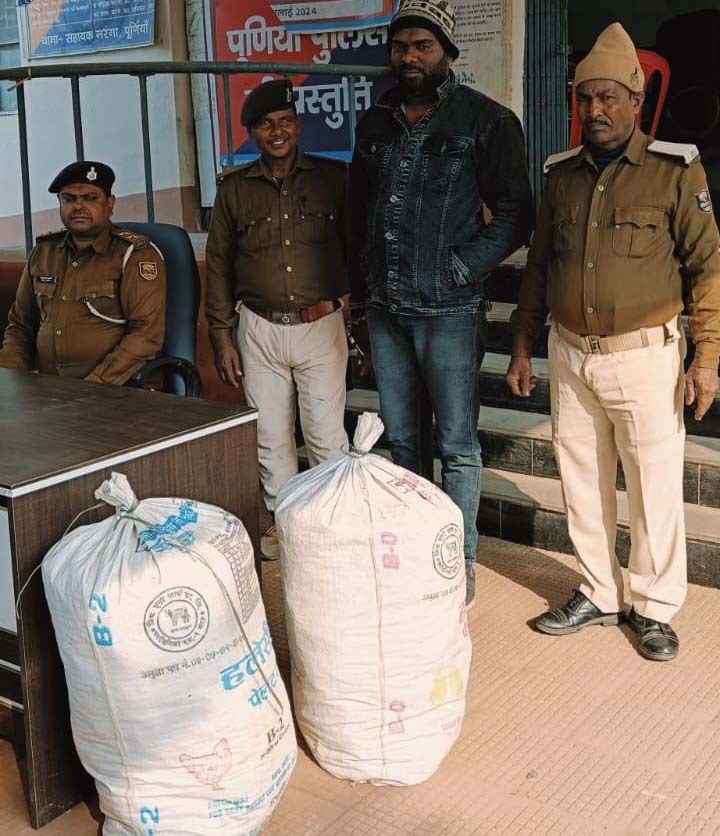 वाहन चेकिंग के दौरान पकड़ाया गांजा पूर्णिया. मरंगा थाना की पुलिस ने वाहन चेकिंग के दौरान एक बाइक पर लोड कुल 48.850 किलो गांजा बरामद कर एक तस्कर को गिरफ्तार कर लिया. बुधवार को मरंगा थानाध्यक्ष रूपक रंजन सिंह अन्य पुलिस कर्मियों के साथ आसूचना संकलन एवं वाहन जांच के लिए थाना से प्रस्थान किये थे. इसी क्रम में उफरैल चौक से पश्चिम कुछ दूरी पर वाहन जांच प्रारंभ किया गया.वाहन जांच के क्रम में मरंगा की ओर से एक बाइक आता हुआ दिखायी दिया, जिसे वाहन जांच के लिए रूकने का ईशारा किया गया, तो बाइक चालक पुलिस को देखकर तेजी से भागने का प्रयास किया.उसे साथ के सशस्त्र बल के सहयोग से पकड़ लिया गया. पकडाये युवक से नाम पता पूछने पर उसने अपना नाम विकास कुमार साह, पिता सुरेश प्रसाद साह,साकिन बसैटी थाना बौसी जिला अररिया बताया. इसके बाद तलाशी ली गई, तो उसके बाइक पर लदा हुआ कुल 48.850 किलो गांजा बरामद किया गया. बरामद गांजा, एक मोबाइल एवं बाइक जप्त करते हुए अभियुक्त को गिरफ्तार किया गया. पूछताछ के क्रम में अभियुक्त के द्वारा गांजा तस्करी के फारवर्ड एवं बैकवर्ड लिंकेज का खुलासा किया गया है. इस संबंध में विधि-सम्मत कार्रवाई की जा रही है.