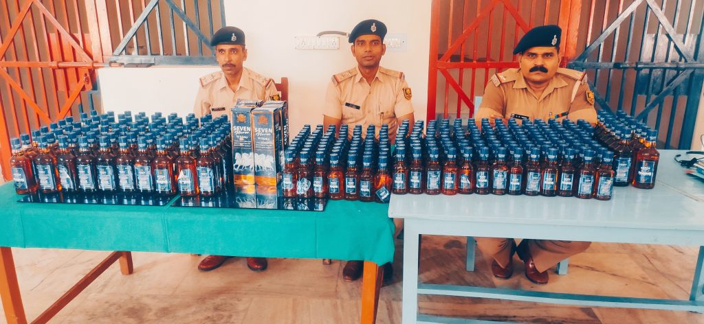 भवानीपुर. बीती देर संध्या बलिया थानाध्यक्ष अजय कुमार ने छापामारी कर 85. 65 लीटर अंग्रेजी शराब बरामद की. थानाध्यक्ष अजय कुमार ने बताया कि गुप्त सूचना मिली कि आश्रम टोला वार्ड संख्या 8 निवासी रंजीत मंडल अपने चाचा छोटे मंडल बलिया आश्रम स्थित वासा पर अंग्रेजी शराब छिपा कर रखा है. सूचना मिलते ही थानाध्यक्ष अजय कुमार के नेतृत्व में छापामारी दल में पुअनि मृत्युंजय कुमार, पुअनि अरविंद राय, पुअनि अरविंद कुमार सिंह, सअनि शिवदास सिंह यादव व सशस्त्र बल के साथ छापामारी की गयी. आश्रम टोला बलिया स्थित छोटे लाल मंडल के बासा पर पहुंचे तो पुलिस गाड़ी देखकर दो व्यक्ति वासा से पीछे खेत होकर भागने में सफल रहे. दोनों की पहचान आश्रम टोला निवासी छोटेलाल मंडल एवं रंजीत मंडल के रूप में हुई. बासा की तलाशी में प्लास्टिक के बोरोंसे 750 एम एल का व्हिस्की 6 बोतल, 375 एम एल का व्हिस्की 106 बोतल, 180 एम एल का 230 बोतल कुल शराब 85. 66 लीटर 342 बोतल जब्त की गयी. छोटेलाल मंडल एवं रंजीत मंडल के विरुद्ध बिहार मद्य निषेध एवं उत्पाद अधिनियम के अंतर्गत थाना कांड संख्या 26/24 प्राथमिकी दर्ज की गयी. फोटो:– 31 पूर्णिया 6-छापेमारी में बरामद शराब के साथ थानाध्यक्ष एवं अन्य.