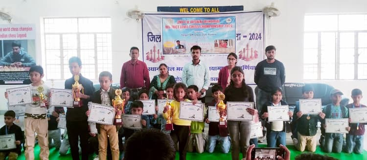 पूर्णिया. सीके जायसवाल मेमोरियल जिला स्तरीय शतरंज प्रतियोगिता का पुरस्कार वितरण खेल भवन सह व्यायामशाला में संपन्न हुआ. यह प्रतियोगिता कक्षा 3 और 4 के लिए आयोजित थी. इसमें 35 बालक-बालिका शतरंज खिलाड़ियों ने भाग लिया. समारोह के मुख्य अतिथि समाजसेवी स्वाति अग्रवाल ने बच्चों को मेडल, सर्टिफिकेट व ट्रॉफी देकर के पुरस्कृत किया. उन्होंने कहा कि शतरंज खेलने से मानसिक विकास बहुत तीव्र गति से होता है और निर्णय लेने की क्षमता बढ़ती है. मंच संचालन टारगेट जीएम शतरंज क्लब के सचिव सह अंतरराष्ट्रीय रेटेड शतरंज खिलाड़ी अमृत साजन कर रहे थे. प्रतियोगिता में मुख्य निर्णायक की भूमिका किशनगंज के अमानुल्लाह व अंशुमन ने निभायी. इस मौके पर बच्चे के अभिभावक व खेल प्रेमी मौजूद थे. प्रतियोगिता में जीत हासिल करने वाले खिलाड़ियों में बालक वर्ग में प्रथम स्थान आदित्य गुप्ता को मिला. द्वितीय स्थान पर आर्यन राज, तृतीय स्थान पर प्रांशु सिंह, चौथे स्थान पर मिहिर राज और पांचवे स्थान पर समर्थ आनंद रहे. इसी तरह बालिका वर्ग में प्रथम स्थान पर कियारा गोलछा, द्वितीय स्थान पर अर्पिता कुमारी और तृतीय स्थान पर प्रतीक्षा राज रही. फोटो–17 पूर्णिया 21- पुरस्कृत शतरंज खिलाड़ी व अन्य.