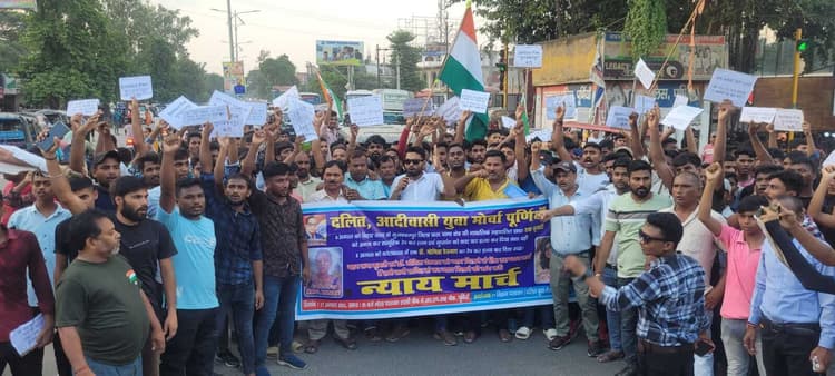 पूर्णिया. मुजफ्फरपुर में महादलित की बेटी के साथ रेप के बाद हत्या के विरोध में दलित, आदिवासी युवा मोर्चा ने न्याय मार्च निकाला. इस मार्च का नेतृत्व मोर्चा के जिला संयोजक सह दलित युवा नेता विक्रम पासवान कर रहे थे. यह आक्रोश मार्च भोला पासवान शास्त्री चौक से निकल कर गिरजा चौक होते हुए आरएन साव चौक पहुंचा जहां मुख्यमंत्री का पुतला दहन कर आक्रोश व्यक्त किया. मौके पर विक्रम पासवान ने कहा कि बहुत ही शर्म की बात है कि मुजफ्फरपुर में 11 अगस्त को एक महादलित परिवार की बेटी की हत्या कर दी गयी. उन्होंने कहा कि यह दुःख की बात है कि ऐसे अपराधियों की अभी तक गिरफ्तारी नहीं हुई है. उन्होंने सरकार से हत्यारे की अविलंब गिरफ्तार करने की मांग की है. मौके पर आदिवासी विकास परिषद के जिलाध्यक्ष विजय उरांव, बहुजन नेता अजय भारती, पोलो पासवान, आरजेडी के वरिष्ठ नेता शंकर ब्रह्मचारी, बिट्टू पासवान, निप्पू पासवान, राजेन्द्र उरांव आदि मौजूद थे. फोटो:18 पूर्णिया 16- न्याय मार्च में शामिल मोर्चा के नेता एवं अन्य