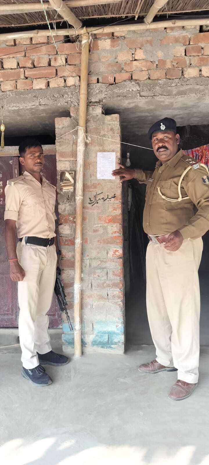 बैसा. रौटा पुलिस ने दुष्कर्म कांड संख्या 140 /24 के फरार वारंटी के घर इश्तेहार चिपकाया. फरार वारंटी अनजार ग्राम सहरया रौटा पूर्णिया बताया गया. रौटा थानाध्यक्ष ज्ञान रंजन के नेतृत्व में रौटा थाना में पदस्थापित पुअनि अवधेश कुमार ने घर पर कुर्की जब्ती करने हेतु इश्तेहार लगाया. रौटा थानाध्यक्ष ज्ञान रंजन ने बताया कि न्यायालय से इश्तेहार निर्गत कर उक्त व्यक्ति के घर पर लगाया गया. इश्तेहार लगाने के दौरान पुअनि अवधेश कुमार सहित पुलिस बल मौजूद थे. फोटो:- 19 पूर्णिया 21- इश्तेहार चिपकाते पुलिस पदाधिकारी.