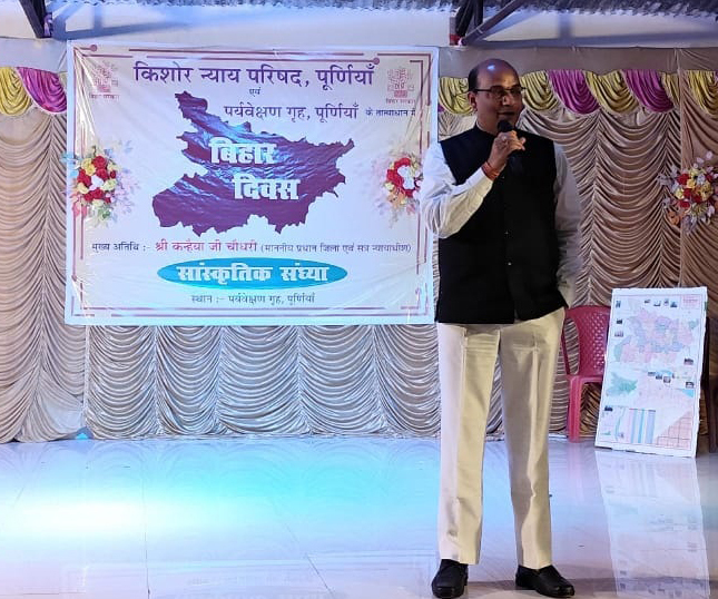 पर्यवेक्षण गृह में तीन दिवसीय कार्यक्रम का आयोजन पूर्णिया. बिहार दिवस के अवसर पर पर्यवेक्षण गृह पूर्णिया में तीन दिवसीय कार्यक्रम का आयोजन किया गया.कार्यक्रम के पहले दिन 22 मार्च को बिहार की स्थापना और प्रगति पर चर्चा की गयी. कार्यक्रम के दूसरे दिन पौधरोपण किया गया. कार्यक्रम के अंतिम दिन सोमवार को पर्यवेक्षण गृह के परिसर में किशोर न्याय परिषद के तत्वावधान में किशोरों ने सांस्कृतिक कार्यक्रमों की प्रस्तुति दी. कार्यक्रम का उद्घाटन मुख्य अतिथि जिला न्यायाधीश कन्हैया जी चौधरी ने दीप प्रज्ज्वलित कर किया. इस दौरान अपर जिला न्यायाधीश गौरव सिंह, किशोर न्याय परिषद के प्रधान दंडाधिकारी संजय कुमार सरोज,पर्यवेक्षण गृह के अधीक्षक धर्मेंद्र कुमार, किशोर न्याय परिषद के सदस्यगण,बाल कल्याण समिति के अध्यक्ष सुमित प्रकाश उपस्थित रहे. किशोरों ने मूक अभिनय की प्रस्तुति के माध्यम से पर्यावरण संरक्षण का संदेश दिया. साथ ही नाटक मंचन के द्वारा नशा मुक्ति का भी संदेश दिया गया. वहीं बच्चों ने बिहार की अस्मिता और समृद्धि पर भाषण और नृत्य की प्रस्तुतियां की. कार्यक्रम की प्रशंसा करते हुए जिला न्यायाधीश कन्हैया जी चौधरी ने पर्यवेक्षण गृह में आवासित किशोरों से सही रास्ते पर चलने की सलाह दी. किशोर न्याय परिषद के प्रधान दंडाधिकारी संजय कुमार सरोज ने धन्यवाद ज्ञापन करते हुए अपने संबोधन में आगत अतिथियों का शुक्रिया अदा किया और कार्यक्रम को सफल बनाने के लिए सभी सहयोगियों को बधाई दी.सांस्कृतिक कार्यक्रमों का मंचन अक्षय शर्मा के निर्देशन में हुआ, जिसमें शिक्षक अनुपम कुमार और सुमित भारती ने सहयोग प्रदान किया. कार्यक्रम के दौरान मो.जाहिद,संजीव कुमार,शिक्षक प्रवीण कुमार,मो.अफजल आलम,गृह पिता अंगद महतो,चंदन कुमार,पीओ गोपाल कुमार,वरीय कर्मी अशोक कुमार,सहायक सोनू कुमार, जमीरुल, बबलू,मनोज,ललन आदि उपस्थित रहे. फोटो. 24 पूर्णिया 36- कार्यक्रम के मौके पर जिला न्यायाधीश.