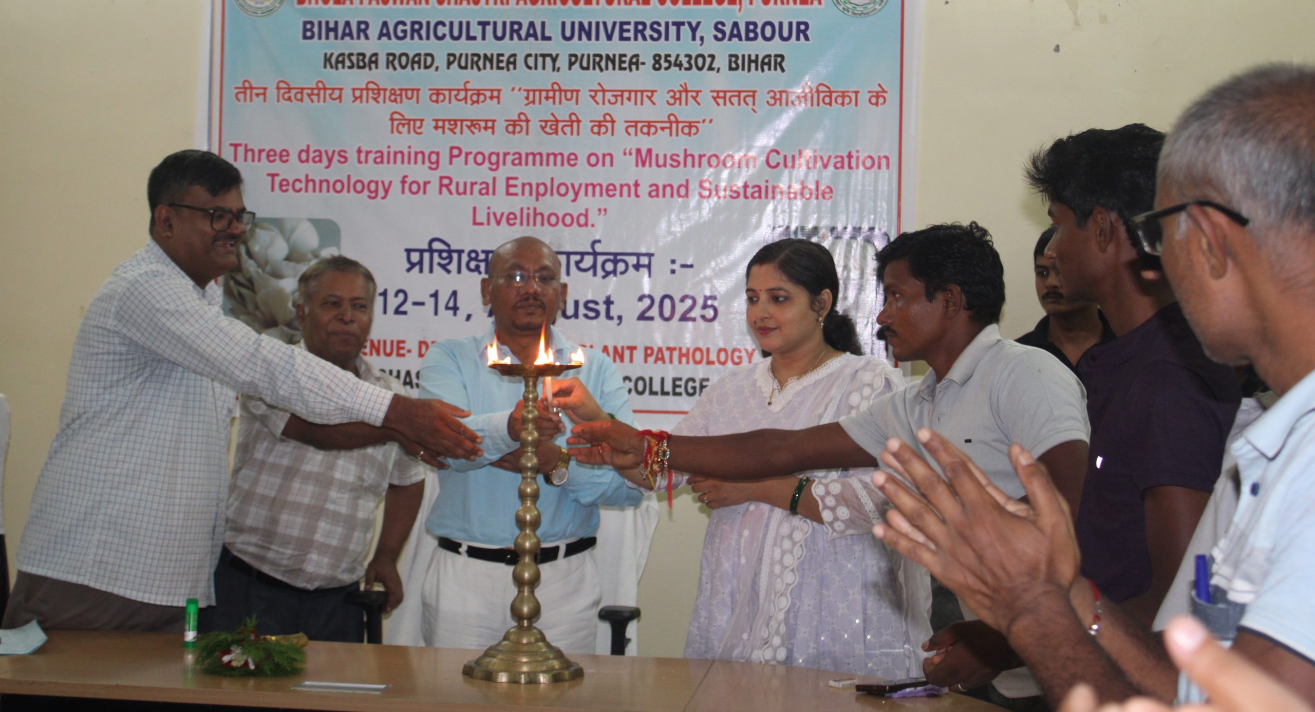 पूर्णिया. घटते हुए भूमि क्षेत्र, खाद्यान्न उत्पादन की समस्या, लोगों में बढ़ती बेरोजगारी, महंगाई, गरीबी और कुपोषण की समस्या के समाधान के लिए बिहार कृषि विश्वविद्यालय सबौर के कुलपति डॉ डी आर सिंह के मार्गदर्शन में भोला पासवान शास्त्री कृषि महाविद्यालय में मशरूम प्रशिक्षण कार्यक्रम का आयोजन किया गया.यह प्रशिक्षण कार्यक्रम आगामी 14 अगस्त तक चलेगा. पूर्णिया कृषि कालेज में इसकी शुरुआत प्राचार्य सह अधिष्ठाता डॉ दिलीप कुमार महतो ने दीप जला कर किया. इस प्रशिक्षण में कटिहार, पूर्णिया, मधेपुरा और गोपालगंज जिले के लगभग पांच प्रखंडों से किसानों और उद्यमियों ने भाग लिया. अपने संबोधन में प्राचार्य ने कहा कि यदि 10 प्रतिशत पुआल या घास का उपयोग मशरूम उत्पादन में किया जाए तो बिहार की पूरी आबादी सप्ताह में एक बार अपने भोजन में मशरूम का उपयोग कर सकती है और राष्ट्रीय आय में करोड़ों रुपये जोड़े जा सकते हैं. प्रशिक्षण के समन्वयक डॉ. मणिभूषण ठाकुर ने तीन दिवसीय प्रशिक्षण की जानकारी दी. उन्होंने बताया कि कृषि अवशेषों का उपयोग करके मशरूम की खेती बिना जमीन के घर, झोपड़ी और किसी भी खाली जगह पर बहुत आसानी से की जा सकती है.