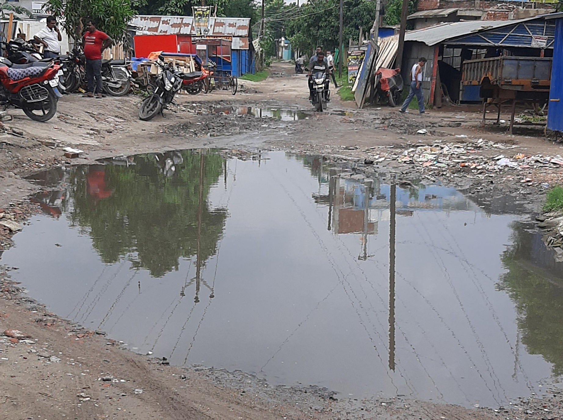 पूर्णिया. इस बरसात के मौसम में आकाशवाणी केंद्र की ओर जानेवाली सड़क की हालत इतनी खराब हो गयी है कि कभी भी कोई भी व्यक्ति या बाइक सवार किसी दुर्घटना का शिकार हो सकता है. राष्ट्रीय राजमार्ग से उस ओर जानेवाली सड़क पर उतरते ही वाहन चालकों के वाहन उबड़-खाबड़ रास्तों पर असंतुलित होने लगते हैं. उसपर बरसात का जमा हुआ पानी नये चालकों के लिए बड़ी दुर्घटना का कारण बन सकता है. मालूम हो कि फोर्ड कंपनी चौक से लगभग पचास मीटर की दूरी पर फोरलेन सडक से बायीं ओर एक जीर्ण-शीर्ण शाखा सड़क सीधा पूर्णिया के आकाशवाणी केंद्र की ओर जाती है जिसपर सड़क की जगह अब गढ्ढे और ठोकरों ने स्थान बना ली है. जहां से बरसात के दिनों में गुजरना और भी दूभर हो जाता है. स्थानीय निवासियों के अलावा आकाशवाणी के पदाधिकारियों ने भी कई बार इस सड़क के निर्माण को लेकर अधिकारियों से बातें की, जनप्रतिनिधियों के संज्ञान में भी बात लायी गयीं लेकिन सिवाय आश्वासन के अबतक कुछ भी हासिल नहीं हो सका मजबूरन यहां के वासियों ने अपने अपने हिसाब से जलजमाव से बचने के रास्ते ढूंढ लिए और कंक्रीट, राबिश व ईंटें डालकर जगह को उंचा कर लिया. इस सड़क से होकर गुजरने वाले स्थानीय लोगों ने खुद के प्रयास से कुछ मेटेरियल डाल कर इसे चलने लायक बना तो दिया लेकिन सड़क के समतल नहीं होने के साथ साथ पानी में फिसलन की वजह से वाहन चालक व पैदल यात्रियों के लिए अंधेरे में हरदम गिरने का ख़तरा बना हुआ है.